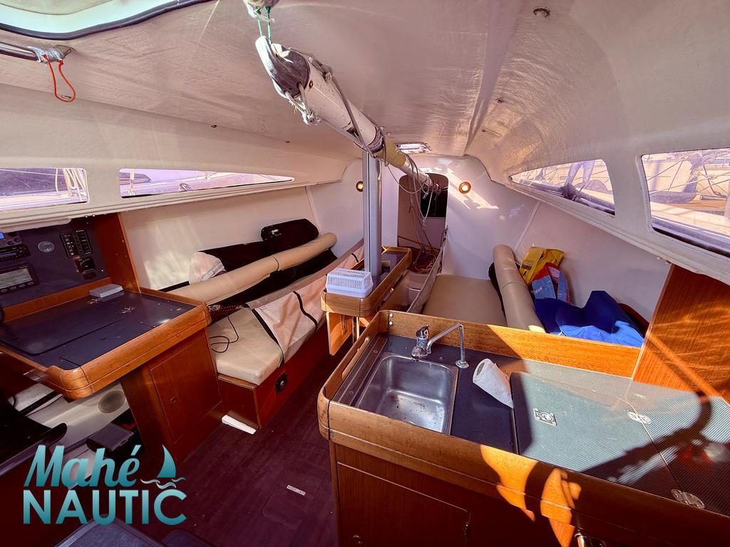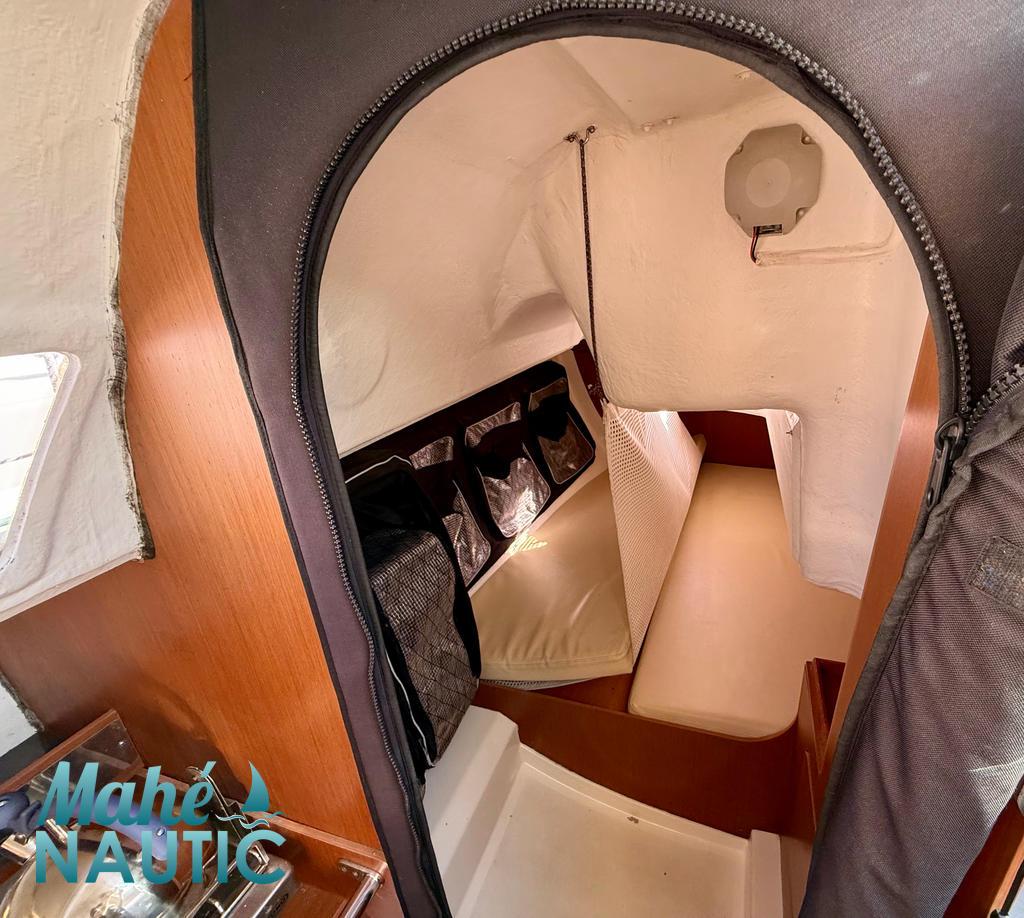 banquette symétrique + table, 1 compartiment salle d'eau avec WC Marin, 1 poste avant avec cloison étanche et accès par panneau de pont ouvrant,