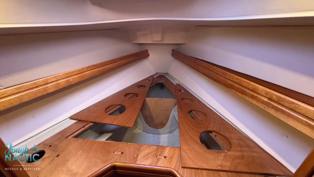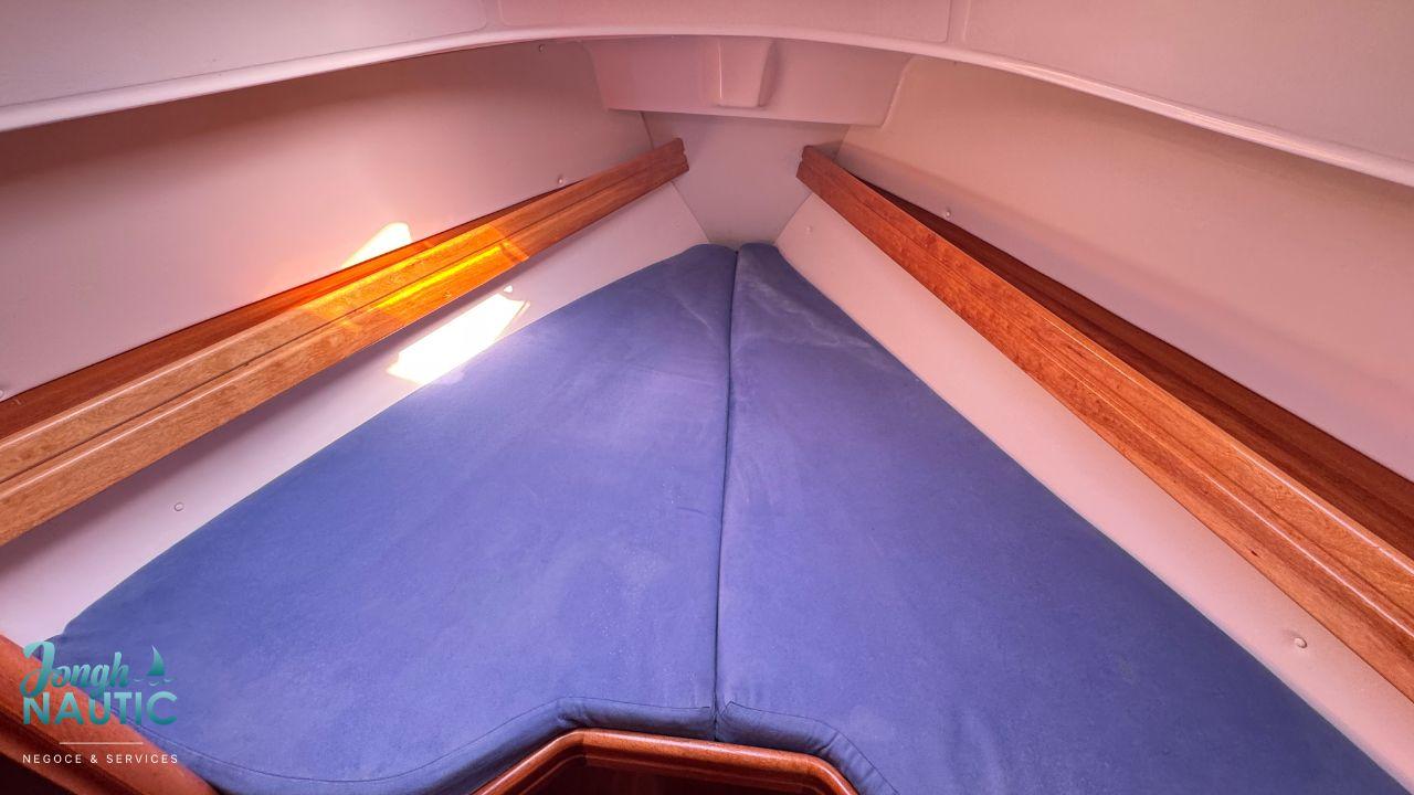 Les photos attestent d’un hivernage réalisé chaque année avec soin. Les coussins et les planchers sont ouverts pour garantir une parfaite ventilation et éviter toute humidité. Les voiles, en très bon état, sont stockées dans un garage tout comme les coussins et il est équipé d’un spi asymétrique avec bout-dehors en inox.